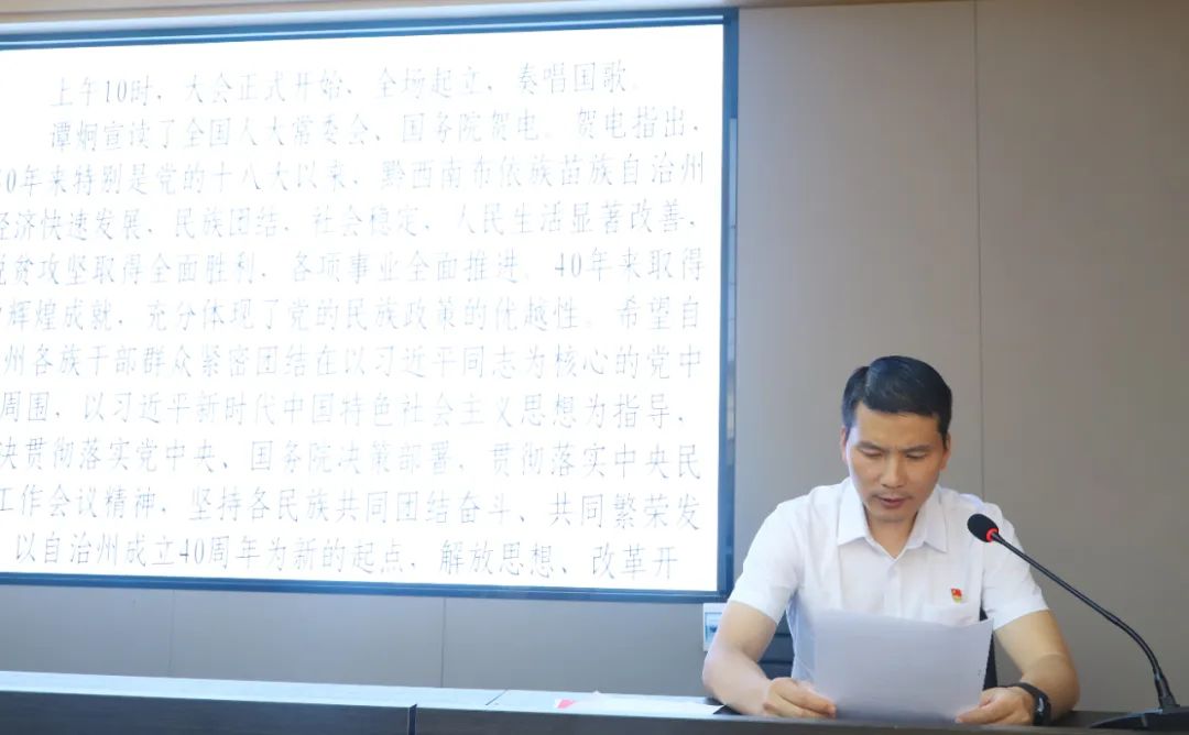 首先,市信恒公司黨支部紀檢委員童利炤同志傳達學習了黔西南州布依族苗族自治州成立40周年慶祝大會精神