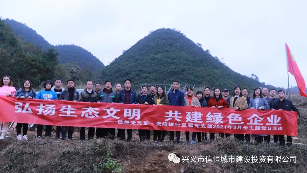 春風拂柳催新綠,植樹造林正當時。在第43個“植樹節(jié)”之際,為積極踐行習近平總書記提出的“綠水青山就是金山銀山”的發(fā)展理念,營造綠色健康的工作生活環(huán)境。2021年3月12日,中共興義市信恒城市建設(shè)投資有限公司支部(以下簡稱:信恒城投公司黨支部)與貴陽銀行黔西南分行直屬黨支部(以下簡稱:貴陽銀行直屬黨支部)聯(lián)合開展2021年3月份主題黨日暨“植樹節(jié)”活動。