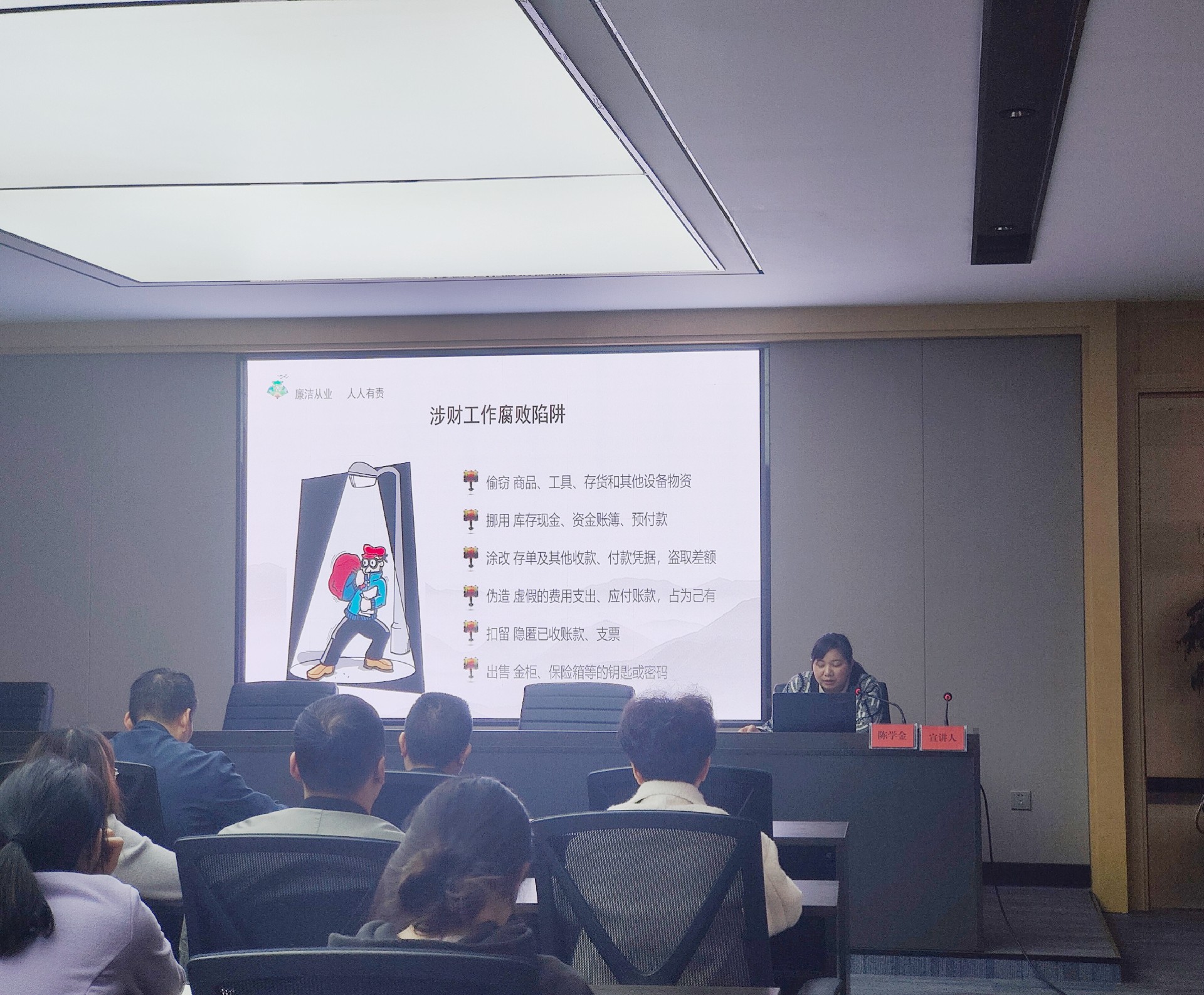 作為國(guó)企財(cái)務(wù)部負(fù)責(zé)人,陳學(xué)金同志以案為鑒,深入講解了財(cái)務(wù)人員、業(yè)務(wù)員或采購(gòu)員這樣常與客戶打交道的崗位該如何抵制誘惑,用多個(gè)案例分析了日常工作中遇到的實(shí)際情況與職業(yè)風(fēng)險(xiǎn),最后著重講了貪污受賄所帶來(lái)的后果,并希望全體干部職工要算好人生“六筆賬”,時(shí)刻保持清醒和韌勁,特別是財(cái)務(wù)人員要牢記崗位職責(zé),廉潔高效的開展工作,努力為公司發(fā)展提供堅(jiān)強(qiáng)有力的財(cái)務(wù)保障,確保國(guó)有資產(chǎn)安全。